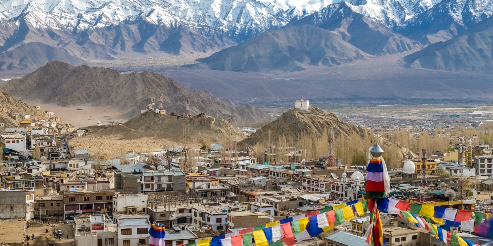 Subjects: prayer flags, street life, monastery details, evening light over Leh.